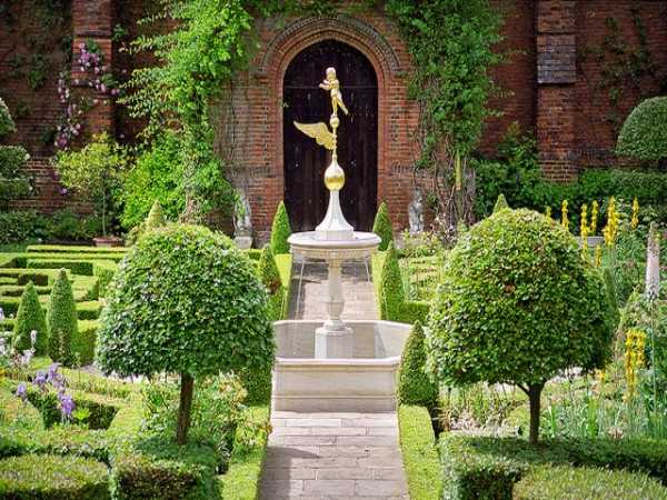 Очень гармонично будет смотреться фонтан, установленный в глубине сада. Там же можно поставить лавочки и качели для детей. Таким образом сад превратится в настоящий парк, где можно будет отдыхать всей семьей и обустройство двора будет законченным.