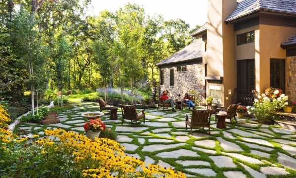 Каменные элементы могут стать декором дорожки. Из камней или кирпича можно составлять невероятно уютные площадки для отдыха — патио, которые способны украсить любой двор частного дома.