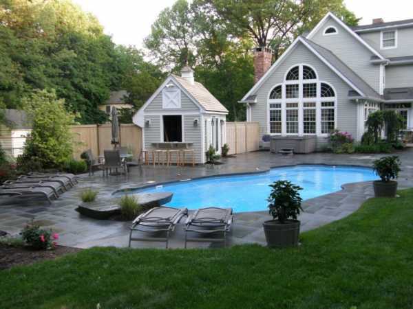 Водопад, фонтан, бассейн – главные украшения двора в летний сезон