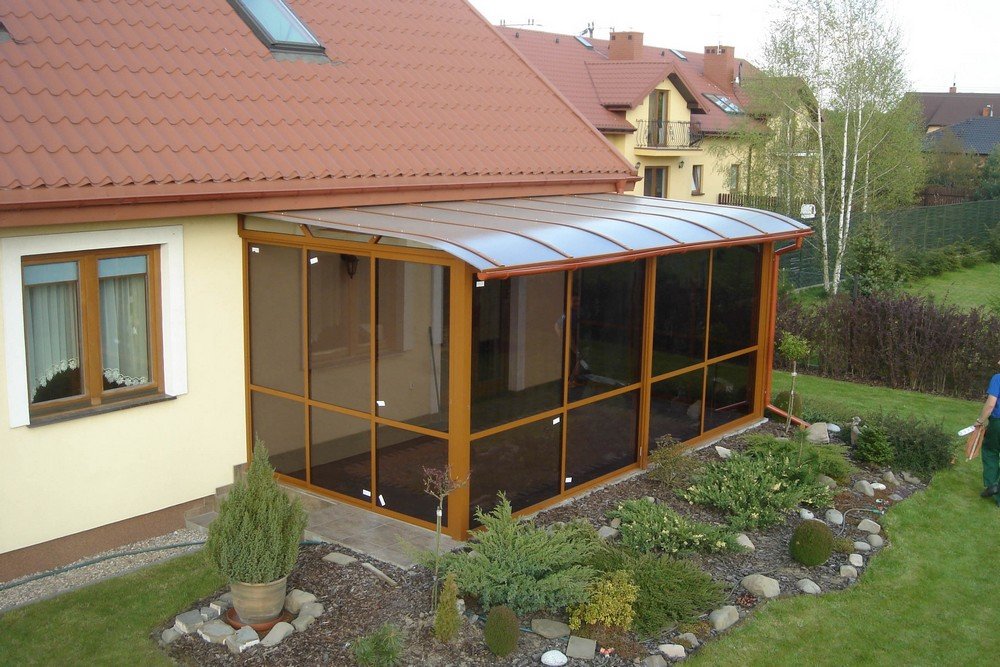 Большую популярность приобретают конструкции веранды из поликарбоната. Благодаря таким свойствам, как высокопрочность, низкая теплопроводность, пластичность и огромная цветовая палитра, возможно создание веранды любой формы и необычного дизайна.