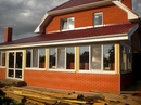 Террасы и веранды к дому часто делают из кирпича. Лучше всего строение смотрится у старого кирпичного дома, при этом желательно выбирать кирпич одного цвета и размера. Кирпичная веранда требует мощного, крепкого основания (столбчатый или ленточный фундамент, в зависимости от грунта).