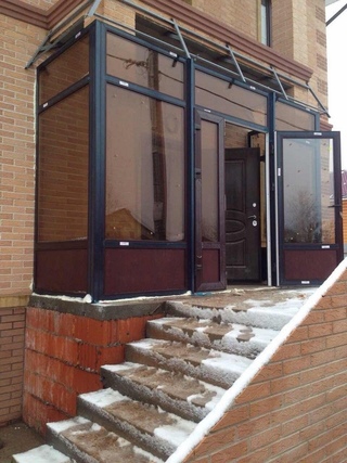 Вариант крыльца с застеклением – это обычно бетонный или каменный фундамент с лестницей и козырёк, опирающийся на сваи. При помощи уголков длиной по высоте сваи для козырька формируют каркас. При этом уголки приваривают к сваям и вставляют деревянные двойные рамы с проложенным между ними стеклом с резиновой подкладкой.