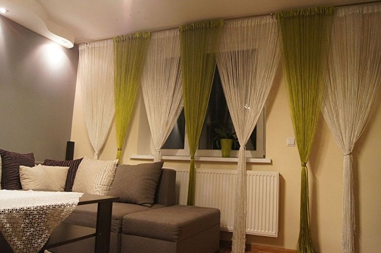 Шторы-нити состоят из многочисленных тонких веревочек, дарящих эффект воздушности. Они не «ложатся» на интерьер целостным ярким пятном, или тяжеловесным акцентом, даже если имеют яркую расцветку. Драпируя веревочки-нити различными способами, можно хоть каждый день преобразовывать вид оконного проема и создавать особое настроение в комнате.