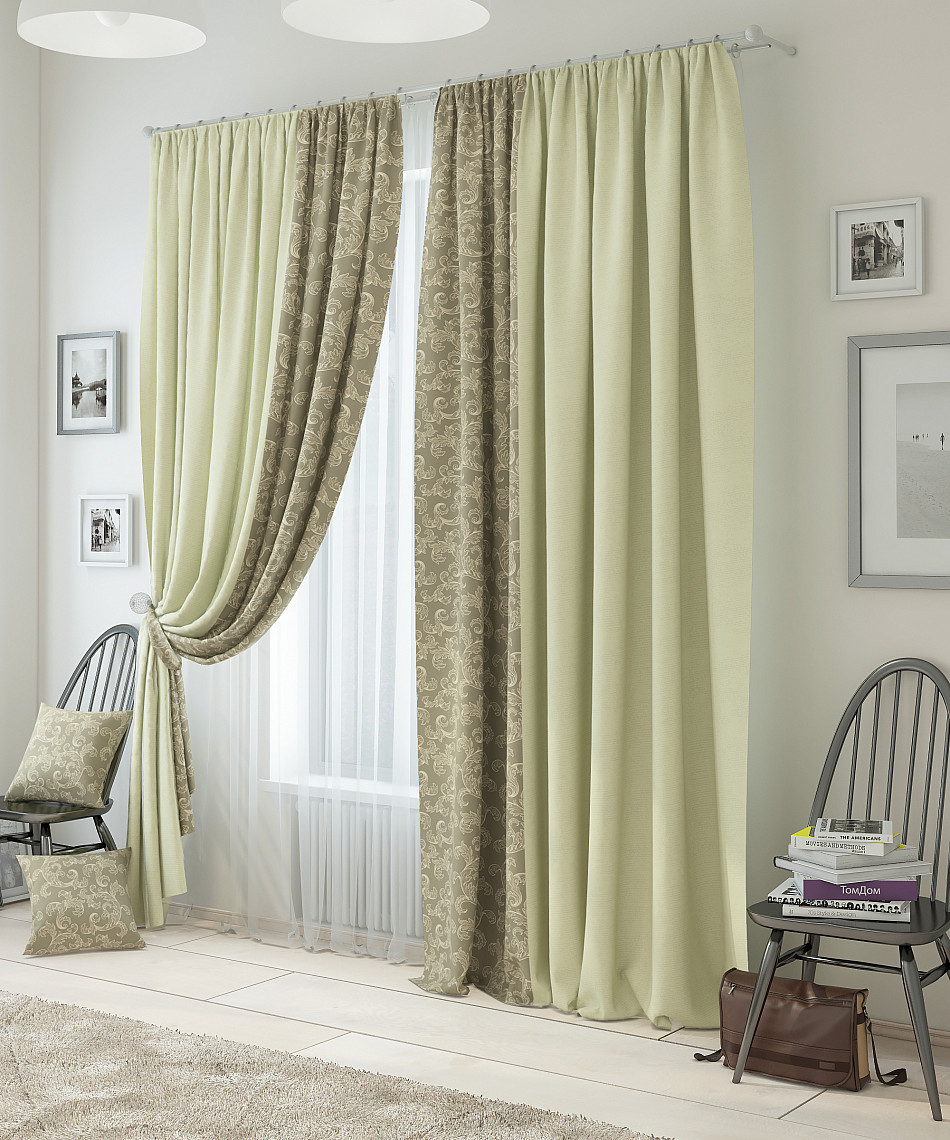 - При одновременном использовании портьер и штор, одна из составляющих должна сочетаться с тоном обоев. При двойном оформлении вы можете использовать контрастные цвета, но один из них непременно должен вторить оттенку обоев.
