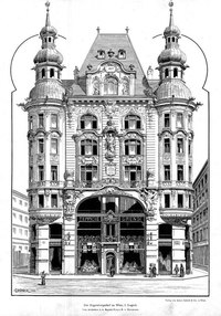 Общая структура здания напоминает палаццо эпохи Возрождения (призматический объем, замкнутый двор), однако в эту традиционную схему внесен элемент «неожиданности»: центральная часть главного корпуса напоминает вставку в основной объем.