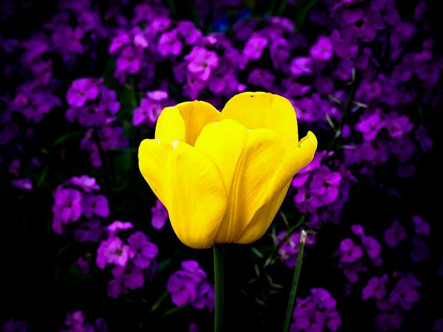Сочетание желтого цвета с фиолетовым, сиреневым, пурпурным относятся к разряду наивысшей выразительной пары, так как основаны на принципе дополнительного контраста (цвета, находятся на одной прямой в кругу Иттена и при смешивание цветовых лучей дают серый). Эта комбинация – удивительный инструмент в руках творца, который сможет заставить погрузится в полную гармонию, только благодаря этим двум ощущениям цвета. Однако, в некоторых случаях комбинация покажется слишком топорной, навязчивой, плоской. Поэтому, чем сложнее, мутнее тон как первого, так и второго, тем приятней общее впечатление.