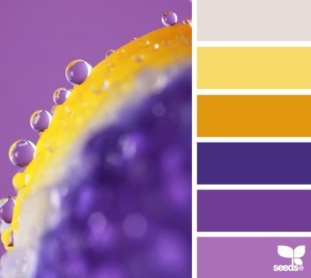Ярко-желтый сочетается с фиолетовым: голубо-фиолетовым, фиалковым, орхидей, пурпурным, виноградным. Базовые нейтральные: белоснежный, стальной, темно-серый.