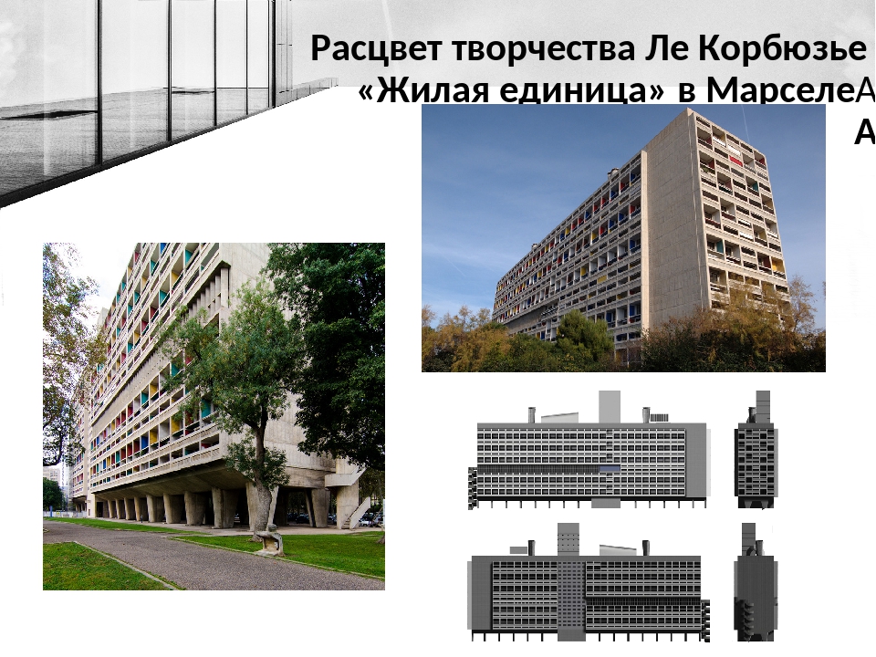 Ле Корбюзье развил в 1918 году свои идеи функционального и минималистического зодчества, за что снискал славу помешанного, но реализовать их помешали, а потом косвенно помогли мировые военные передряги. Новые подходы и ускоряющие строительство технологии оказались востребованными в разрушенной войной Франции. Марсель, больше многих других городов пострадавший от бомбежки, стал опытной площадкой для архитектурных новаций.