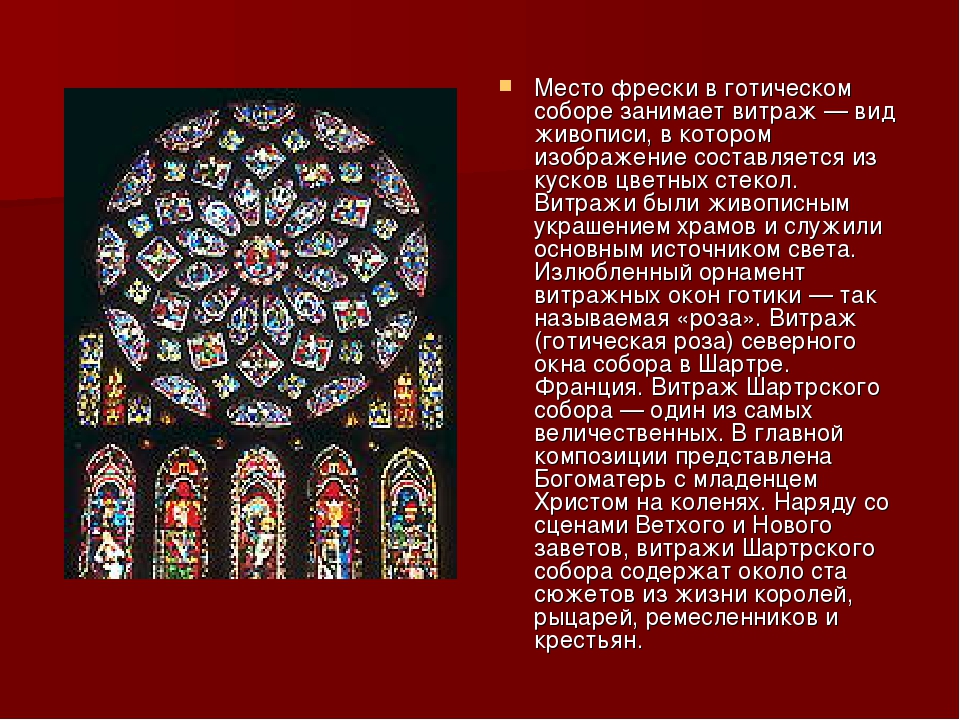 и даже в более крупных, таких как базилика Святого Жюльена в Бриуде, особенно в южной половине страны Франция имеет относительно мало живописи периода ранней готики; в лучшие образцы ранней французской готики — в отличие от архитектуры — выполнены в виде витражей, как в соборах г. Шартра, или Лаона, или Буржа, или скульптуры, особенно многих прекрасных образцов готики. скульптуры, украшающие французские соборы.Как и романский стиль, Готический стиль в архитектуре возник во Франции с где он быстро распространился на большую часть Европы, и в частности в Англию который в то время находился под властью норманнов, а затем анжуйцев, был неотъемлемой частью французского культурного пространства.