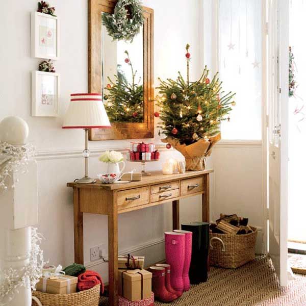 Достаточно часто в таком дизайне фигурируют праздничные елочки, которые могут быть совершенно разных форм и размеров. Сочетаются елочки с каминами, креслами и прочими теплыми элементами гардероба.