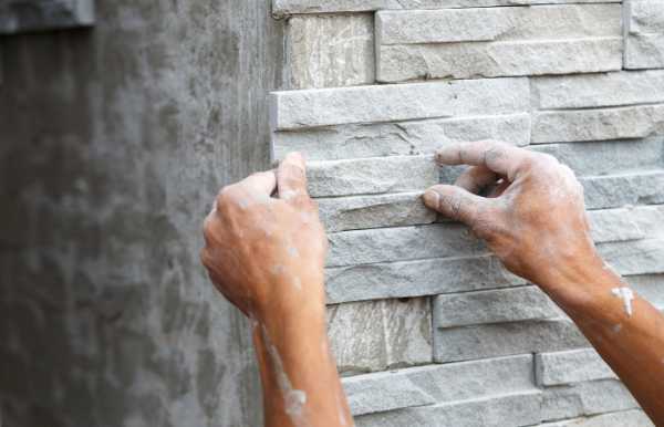 - После высыхания грунтовки переходят к облицовке поверхности. Для этого используют специальный клей для искусственного камня. Клей наносят на плитку и прижимают к нужному месту на стене. Чтобы подкорректировать положение плитки есть 20 секунд, по истечении этого времени клей застынет, и работу придётся переделывать. Укладывать плитку рекомендуется, начиная с нижнего левого угла рабочей поверхности, и далее ряд за рядом, двигаясь вверх. Излишки клея рекомендуется убирать сразу, чтобы облегчить дальнейшую укладку.