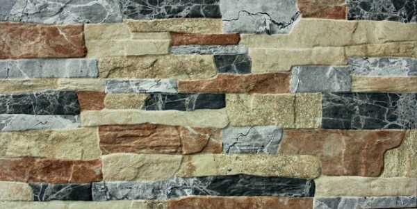 Керамическая (кафельная) декоративная плитка под камень выпускается в широком ассортименте, с рисунками на поверхности, отображающими мельчайшие оттенки и неровности, трещинки и изломы прожилок, плавность переходов из одного цвета в другой и пористость природного материала. Такая плитка может излучать тепло и уют или создавать строгий интерьер, вносить нотку романтичности и поднимать настроение, быть пестрых и веселых, спокойных или приглушенных тонов, скрывать недостатки помещения и выделять его достоинства.