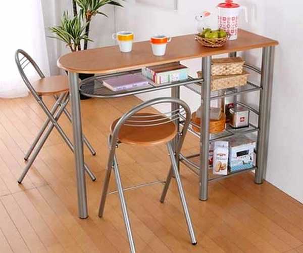 Складной стол с откидывающейся столешницей в виде барной стойки подходит для очень узких кухонных локаций, отличающихся нестандартной планировкой. С позиции комфорта и эстетической гармонии к таким столам лучше подбирать высокие барные стулья.
