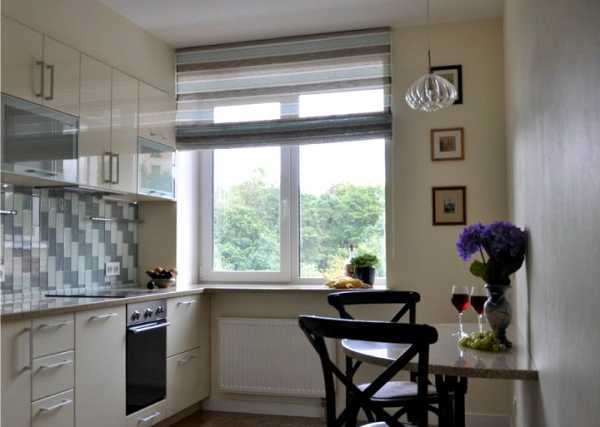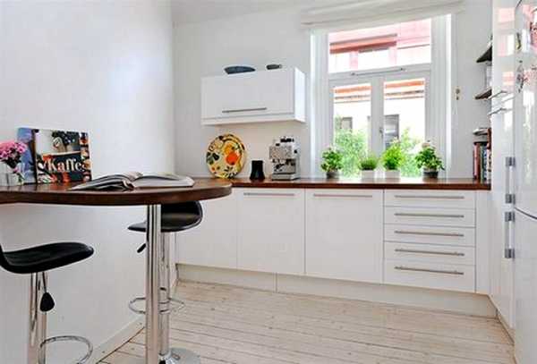 Лучше всего для маленькой кухни приобрести стол с откидной столешницей или раздвижной стол-трансформер. Этот столик в собранном варианте подойдет для двоих, но может стать больше к приходу гостей.