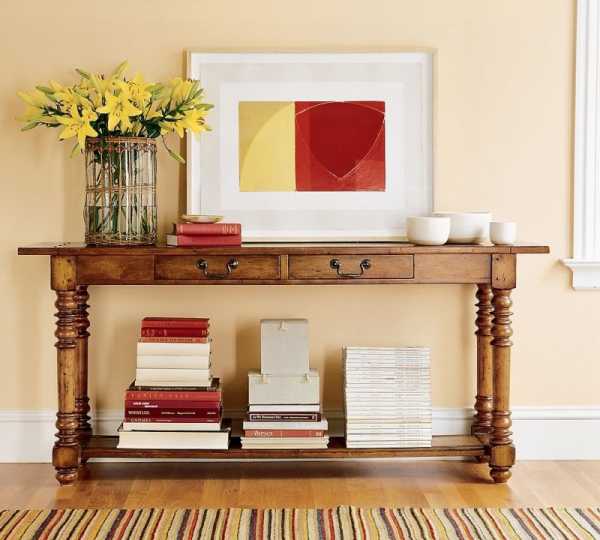 Традиционная консоль. Выглядит, как узкие консольные столики, стоящие у стены, рядом с диваном, иногда в центральной части помещения.