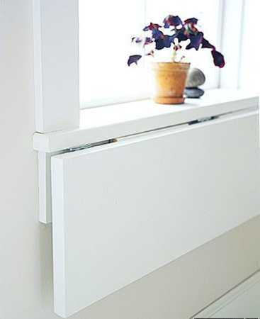 Раскладной стол максимально гармонично впишется в интерьер и не займет много места. Помимо этого, такое расположение позволит сэкономить электричество, так как освещение будет поступать из окна. Если под установленной конструкцией размещен радиатор отопления, столешница должна быть с отверстиями, чтобы достаточный объем теплого воздуха смог проникать в помещение.