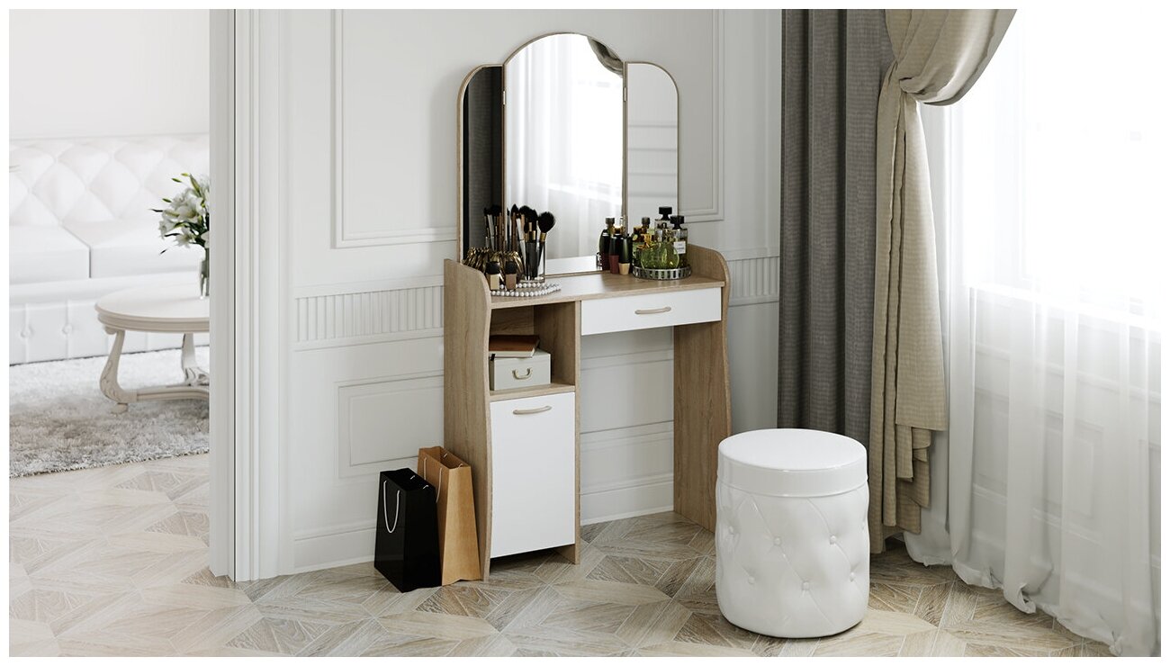 Имеет значение конструкция столика: с ящиками или без, с откидным зеркалом или стационарным, с комодом или двумя тумбами с выдвижными ящиками и так далее.