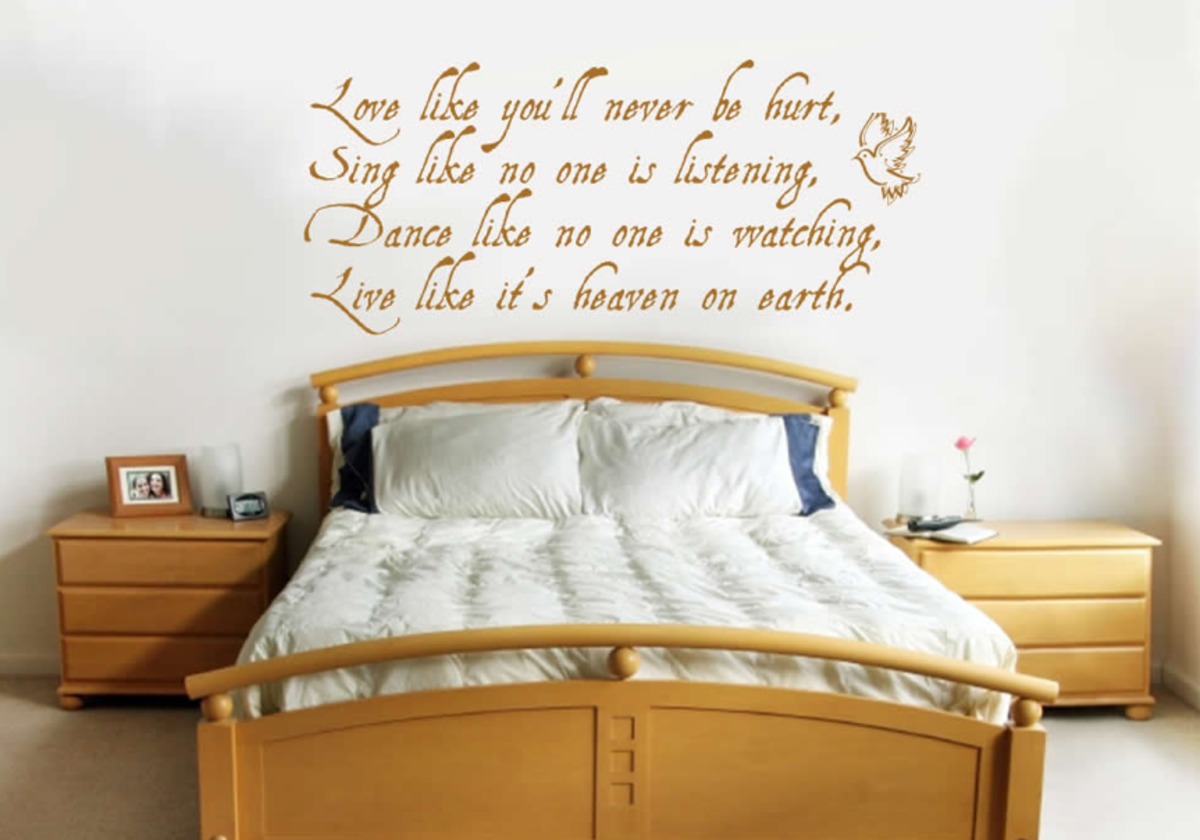 Надписи над кроватью в спальне: оформление и декор стен панно, как украсить фресками, дизайн изголовья кровати