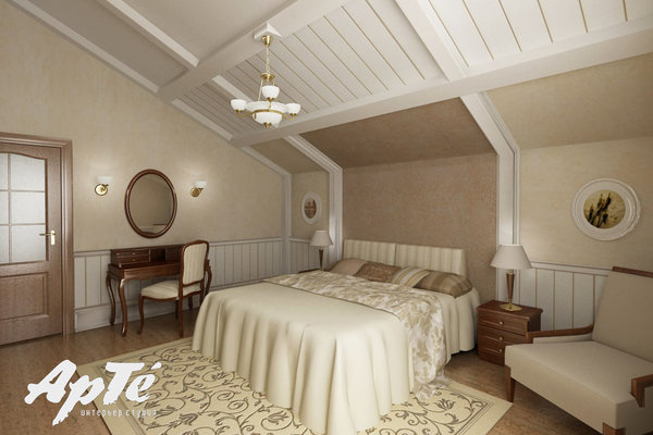 Совет! Cпальню на мансарде можно выполнить в том же стиле, что и весь дом.