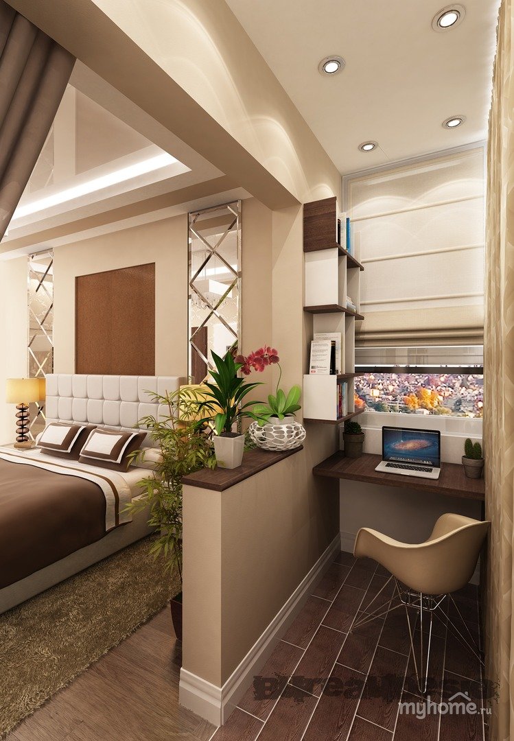 Не каждый балкон можно переделать в спальню. Если такой возможности нет, то люди просто делают ремонт комнату с балконом.Тогда на полученной площади можно сделать небольшую зону отдыха, а оконный проем оборудовать для работы.