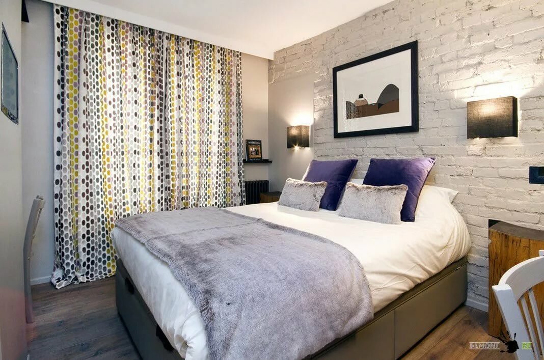- Если хочется добавить спальной зоне немного средневековья, то место над кроватью можно оформить декоративным камнем.