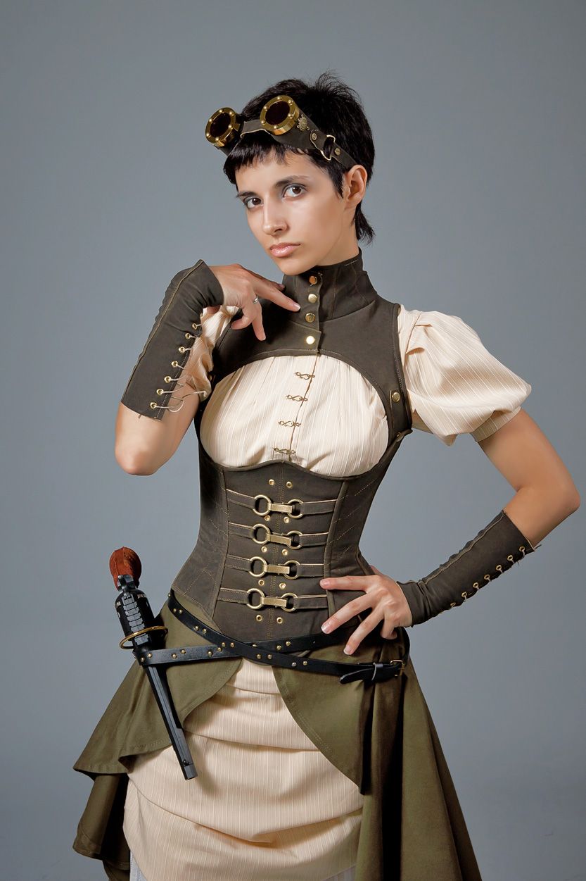 Кожаные корсеты с заклепками, надетые поверх женской одежды в стиле стимпанк, становятся оружием самоуверенной сексуальности.
