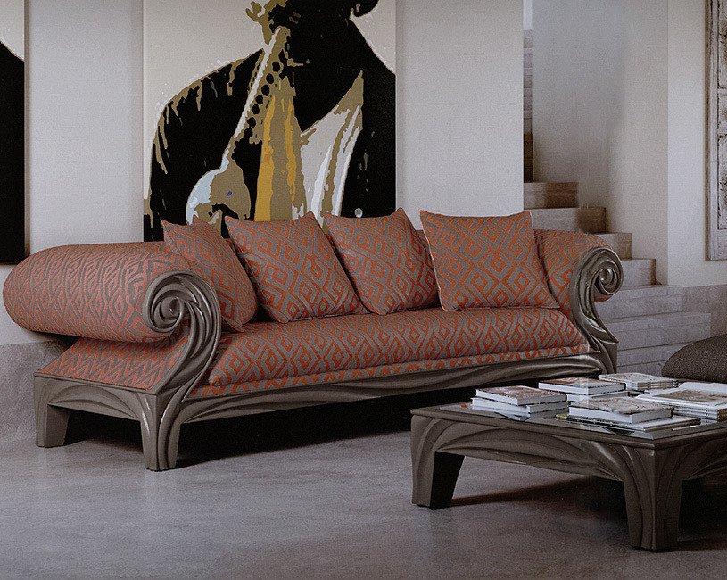 У диванов роль ножек играют львиные лапы, копья, щиты и другие элементы военной атрибутики. В создании традиционных моделей используется красное дерево, современные диваны обходятся имитацией.