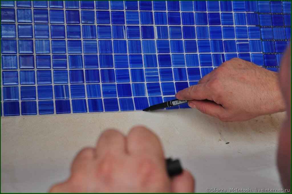 - Далее плитки крепятся параллельными рядами, а излишки клея удаляются сразу влажной губкой.