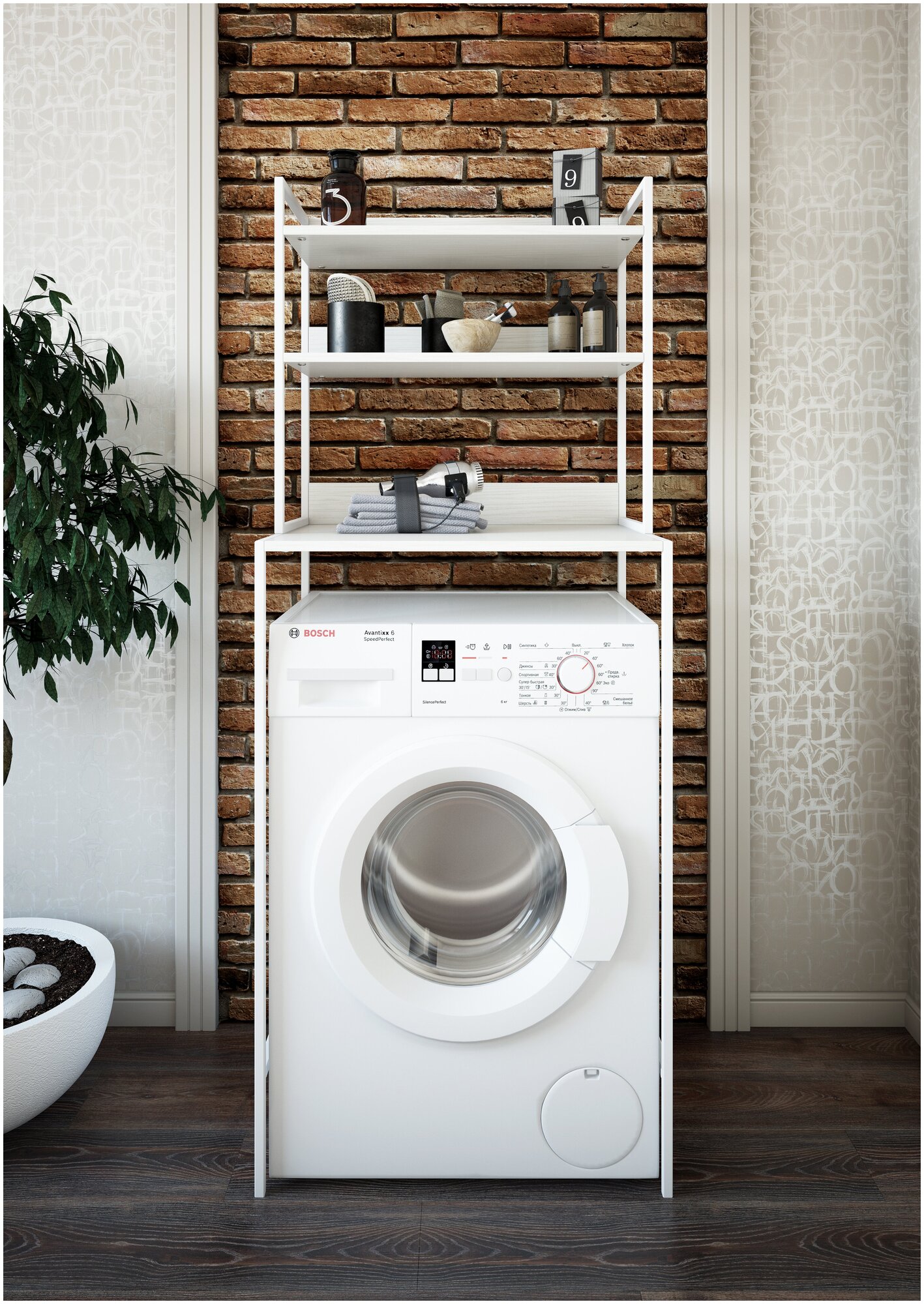- Экономит место: все, что вы ставите на пол или стиральную машину, можно расставить на полках, освободив пол.