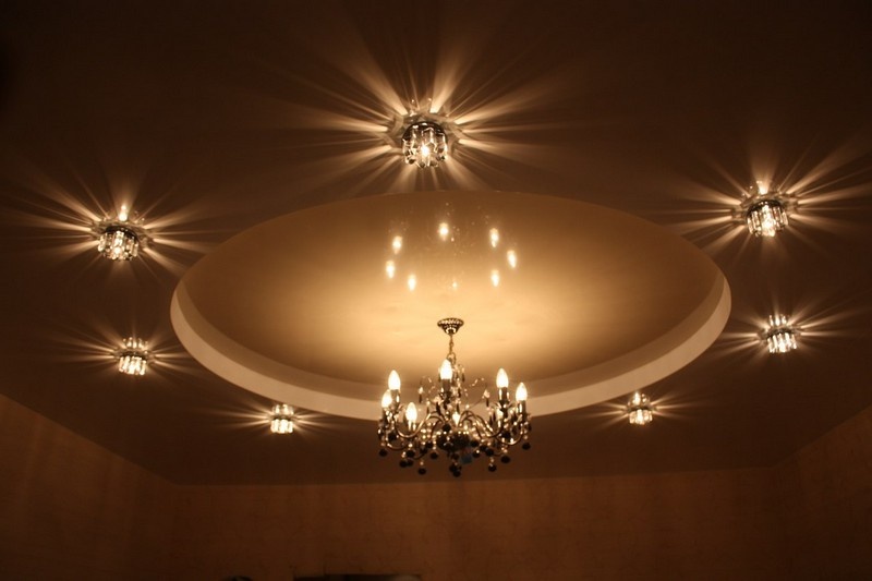 Натяжные потолки с люстрой и точечными светильниками: фото в интерьере