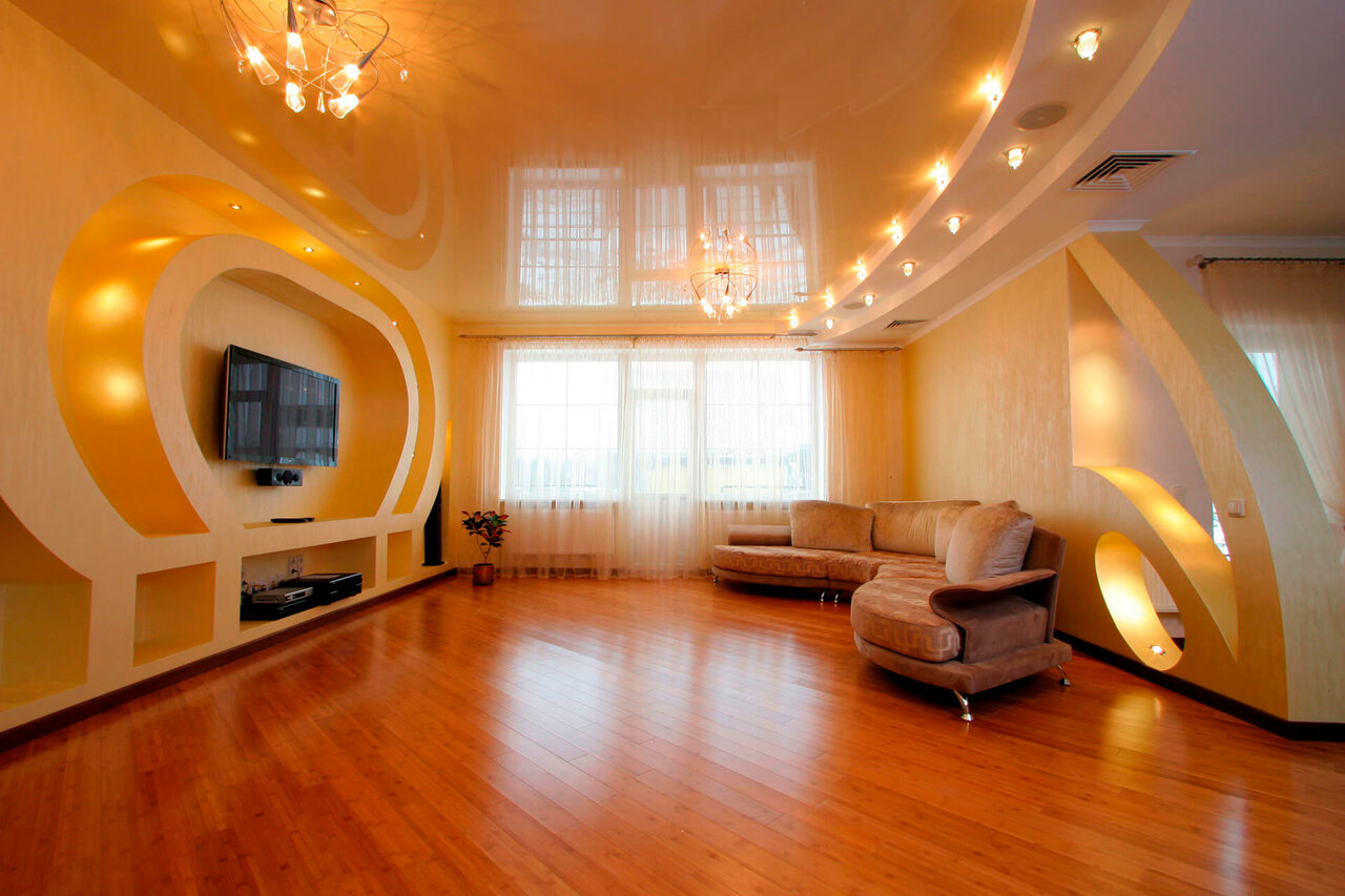 Для удачного декора нужно учитывать ряд конструктивных особенностей помещения:- Для маленькой гостиной в квартирах, типа хрущевка, подойдут одноуровневые конструкции или многоуровневые модели с частичным расположением по потолочной поверхности.