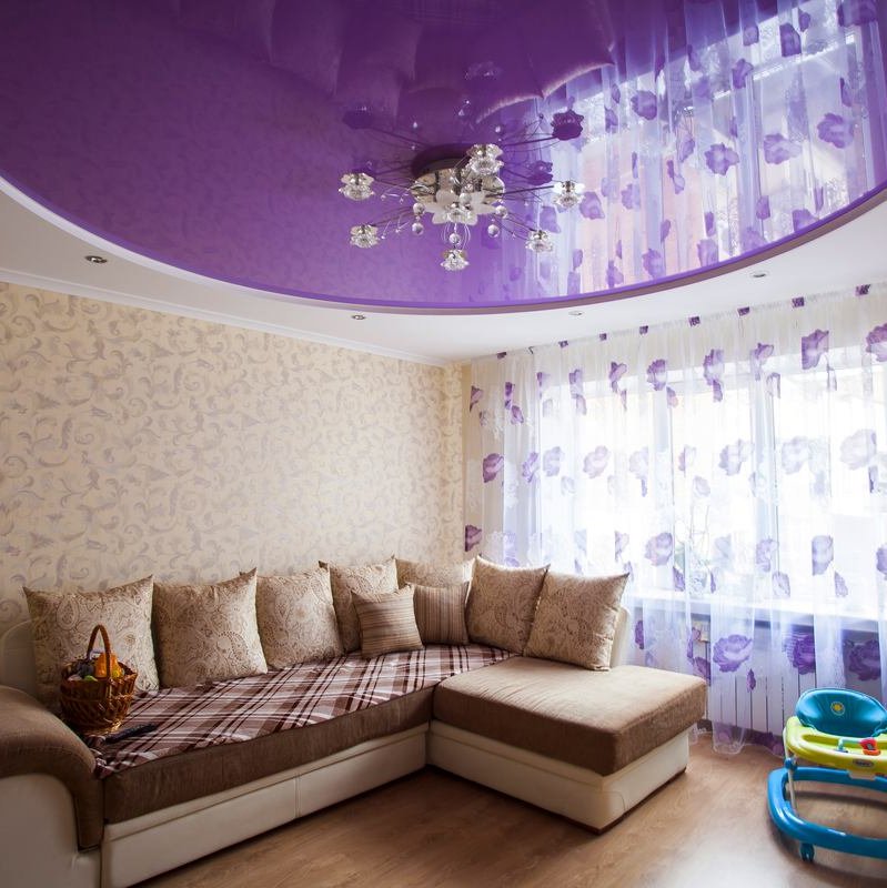 Это позволит вам сохранить в гостиной ощущение прохлады даже в самый жаркий день. И наоборот, если зал находится на теневой стороне, преимущество следует отдать теплым цветам натяжного полотна. Такой дизайн позволит сохранить тепло и уют в комнате;
