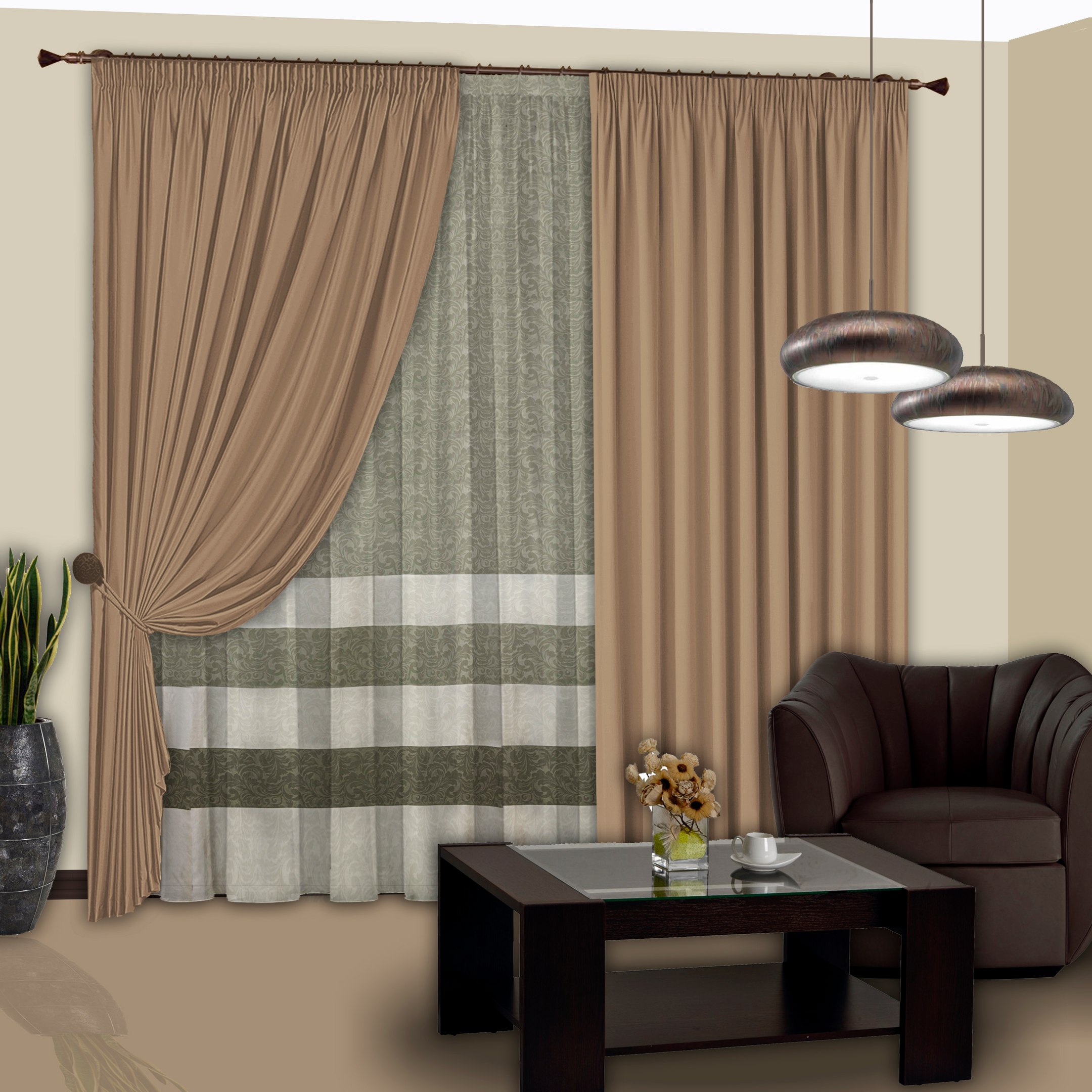 Для гостиных, выполненных в любом стиле, отлично подойдут классические затемненные шторы темных тонов. Особенно гармонично они будут смотреться в сочетании с любыми другими элементами декора того же цвета.