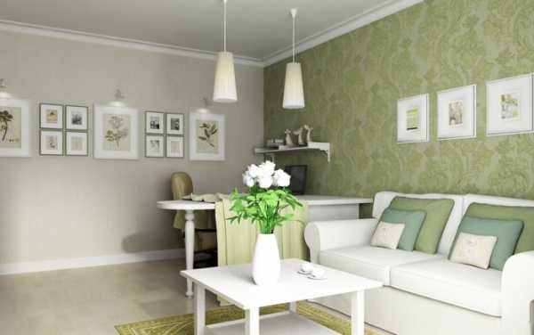 Для отделки зала или любой другой маленькой комнаты лучше выбирать полотна тусклых оттенков горчичного, фисташкового или зеленого цвета.