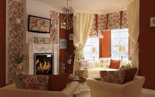При желании сделать на стенах описываемой комнаты какой-либо рисунок, лучше отдавать предпочтение полотнам, на которых цветные орнаменты нанесены на однотонные основы. При этом рисунок может быть ярким. Интерьер зала получится уютным, если рисунок обоев, его цвет будет перекликаться с цветом текстиля или напольного покрытия.