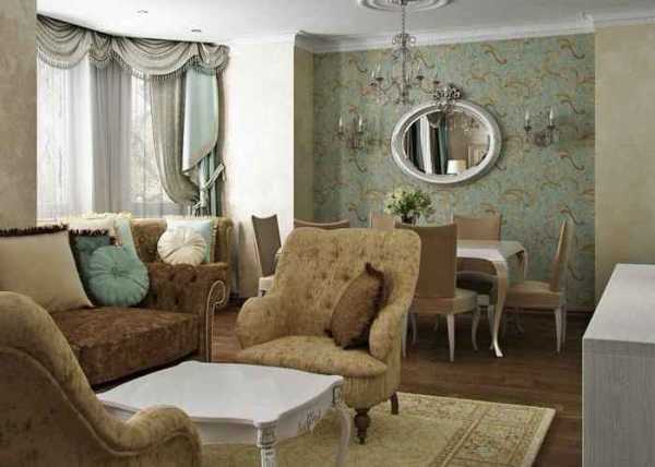 Тот, кто хочет создать в описываемой комнате уголок роскоши, должен обязательно выбрать классический стиль исполнения. Атмосферу торжественности и парадности в маленьком зале создается при помощи узорчатых обоев. Светлый тон, золотой рисунок, глянцевые переливы, они не будут перегружать пространство гостиной, так как будут работать на расширение маленького пространства.