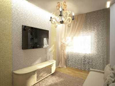 - Наличие на лицевом слое обоев переливов цветов, узоров с блеском, глянцевых поверхностей и 3д эффектов подчеркивает торжественность маленькой гостиной в квартире.