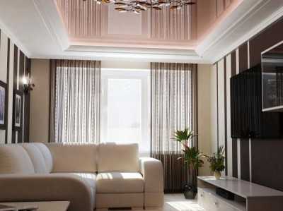 Выбирая краску для потолка или цвет натяжных конструкций для маленького зала важно помнить, что стены должны быть немного темнее. Более светлый потолок будет смотреться более высоким и сделает комнату просторнее. Отличным решением станет глянцевый натяжной потолок на 1-2 тона светлее стен, дополнить который могут декоративные зеркальные вставки на стенах.