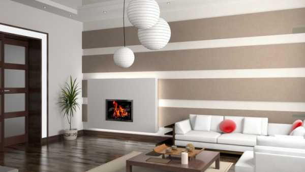 - Увеличиваем высоту потолков. Если главная проблема вашего зала – низкие потолки, ситуацию спасут светлые обои с контрастными вертикальными полосами. Именно такая отделка будет зрительно «вытягивать» комнату. А вот от потолочного плинтуса здесь лучше отказаться – он сведет весь эффект обоев к нулю. Еще один вариант – разделить стены по высоте. Для этого нижнюю 1/3 стены оклейте немного затемненными обоями, а верхние 2/3 – светлыми. Линию соединения полотен можно подчеркнуть лепниной.