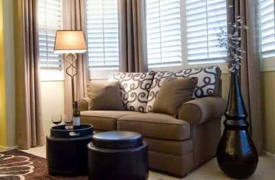 При создании грамотного интерьера, учитывайте расцветку вашей мебели, продумайте из каких материалов будут шторы и какого цвета. Создание полноценного интерьера даже в маленьком зале, предполагает комплексную работу.