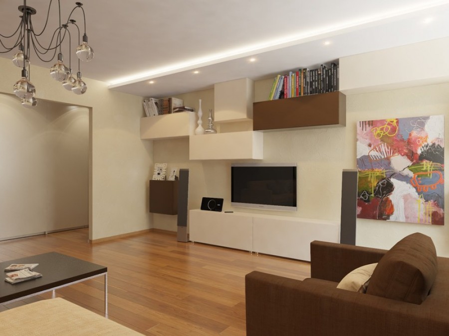 Чтобы это пространство не выглядела загроможденной, тогда нужно подбирать лишь необходимую мебель. Также она должна соответствовать общему оформлению комнаты и подходить по цветовой гамме. В этой зале достаточно поставить диван и два кресла, журнальный столик и заменить громоздкие стенки на подвесные полки, которые будут смотреться стильно и не будут «захламлять» гостиную.