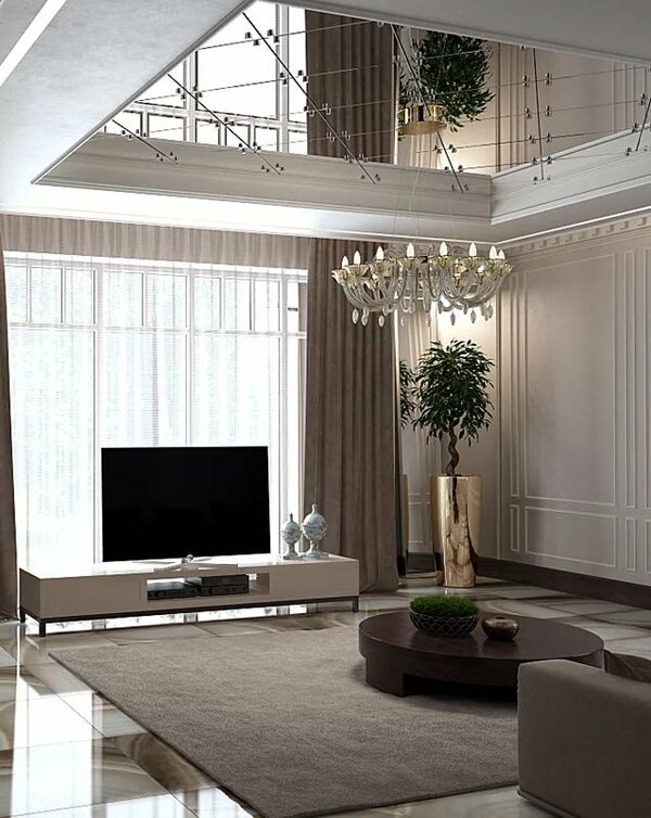 Классический стиль. Для классики подойдет шикарная люстра из хрусталя или многоярусный потолок со встроенными светильниками. В качестве дополнения используются осветительные настенные комплекты в виде свечи. Торшер и несколько настенных светильников доведут интерьер до логического завершения.