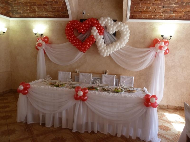 К тому же такая идея украшения свадебного зала стоит относительно невысоко. Часто вход в холл дверные проемы и окна украшают гирляндами из гелиевых шаров. Над столом молодожены решили соорудить из них праздничную арку.Если свадебный зал украшают шары, то эти элементы декора нередко развешиваются по всей площади помещения.